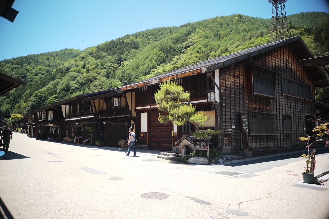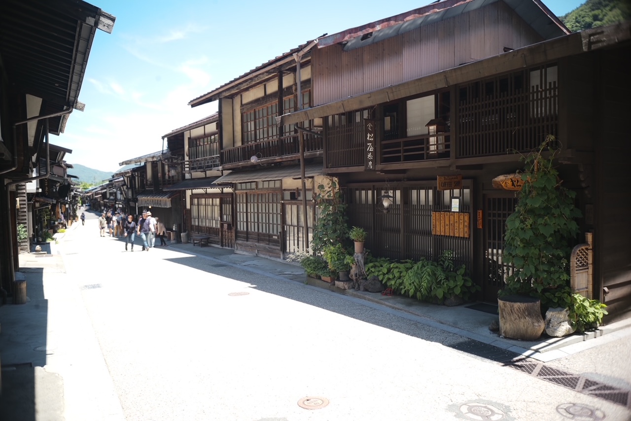 江戸情緒が楽しめる長野県の宿場町、奈良井宿の写真です。気温30度を超え、日差しが非常に強い日でした。